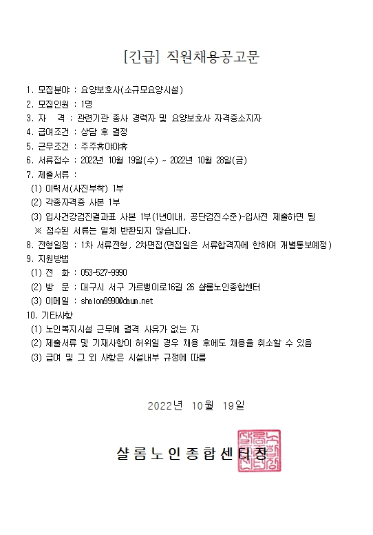 ¼£·Ò³ëÀÎÁ¾ÇÕ¼¾ÅÍ ¿ä¾çº¸È£»ç ¸ðÁý°ø°í(¸¶°¨) 2022.10.20 19:46