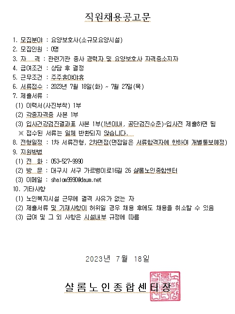 ´ÙÀ½±Û [±ä±Þ] ¼£·Ò³ëÀÎÁ¾ÇÕ¼¾ÅÍ ¿ä¾çº¸È£»ç ¸ðÁý°ø°í
