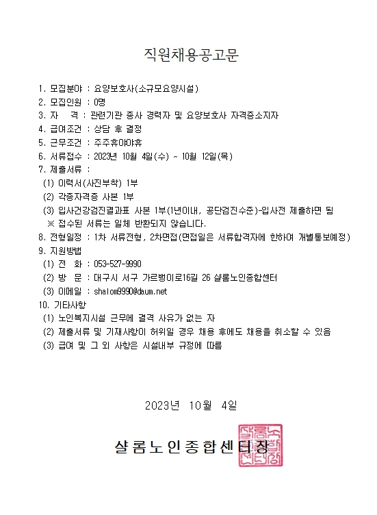 ´ÙÀ½±Û 2023³â ¼£·ÒÀç°¡³ëÀε¹º½¼¾ÅÍ ³ëÀθÂÃãµ¹º½»ç¾÷ Ãß°¡ ¼öÇàÀηÂ(°è¾àÁ÷ »ýȰÁö¿ø»ç) 1¸í ä¿ë °ø°í